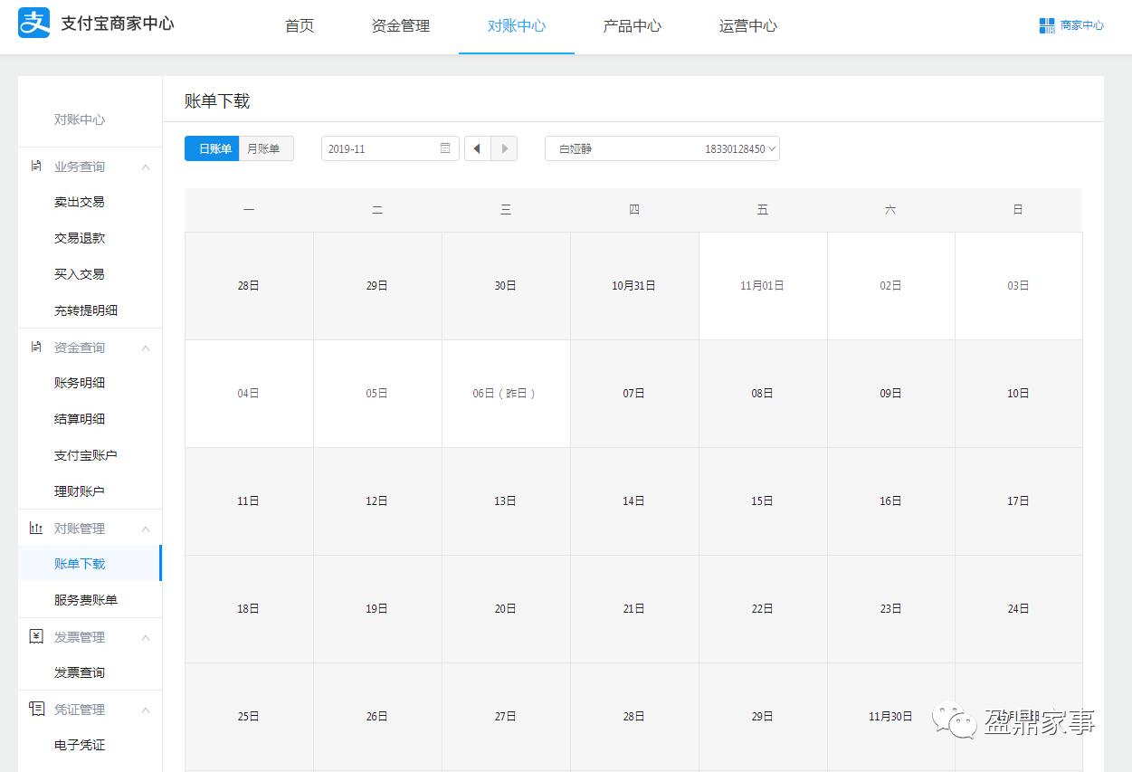 第三步:商家用户,可以点击左侧菜单下的“账单下载”,选择需要查询的年份和月份及日期的账单下载。