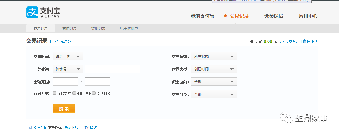 个人用户界面可以自由选择交易时间,从该支付宝账号开始使用起至当下都可以调取,可选择下载Execl格式和TXT格式。