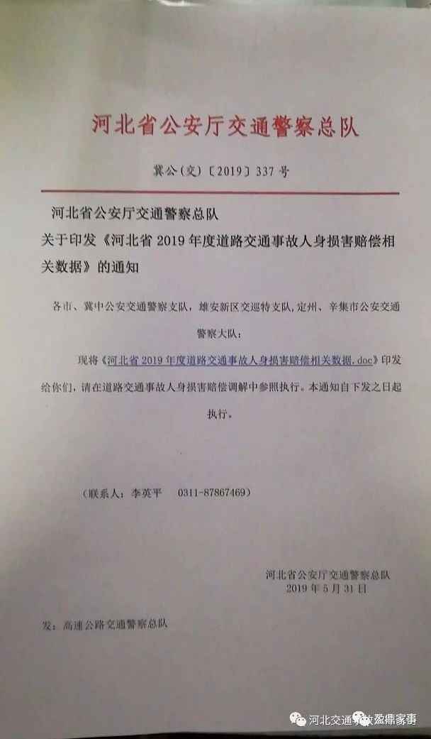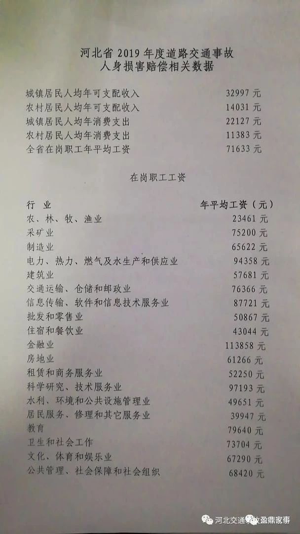 依据河北省公安厅交通警察总队已印发《河北省2019年度道路交通事故人身损害赔偿相关数据》,